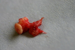 Bandreste und synoviale Wucherungen werden sorgfltig entfernt; ebenso ein fibrses hypertrophes Corpus adiposum genus. Beide Menisken werden sorgfltig auf Beschdigungen oder Ablsungen untersucht. Korbhenkelrisse, Ablsungen oder Zerfaserungen der Menisken knnen beseitigt werden.