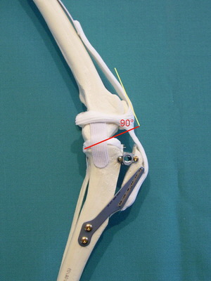 Nach einer Kreuzbandruptur kann die nicht mehr kompensierte nach vorne gerichtete Schubkraft klinisch durch das Schubladenphnomen demonstriert werden. Montavon und Tepic analysierten die Biomechanik und bewiesen, dass der Winkel zwischen Tibiaplateau und dem geraden Kniescheibenband einen signifikanten Einfluss auf die Stabilitt des Kniegelenkes hat. Der Mechanismus, mit dem die TTA das Kniegelenk stabilisiert, besteht in einer nderung des Winkels der Patellarsehne. Dazu wird die Crista tibiae so weit nach vorne verlagert, bis der Winkel zwischen Patellarsehne und Tibiaplateau 90 betrgt. Der Grad des bentigten Advancements“ wird fr jeden Patienten individuell bestimmt. Er ist abhngig von der Gre und den anatomischen Gegebenheiten.